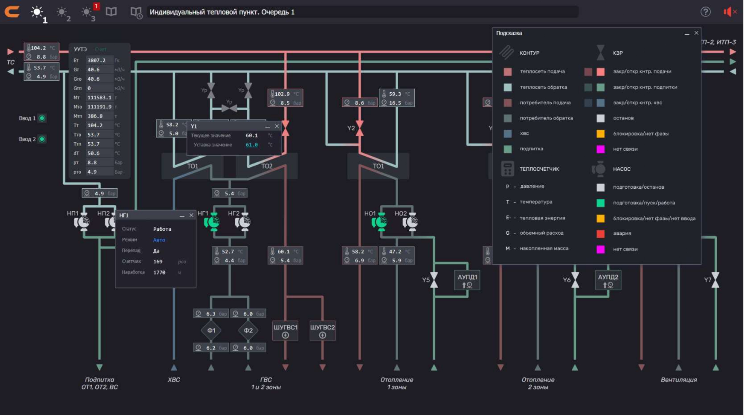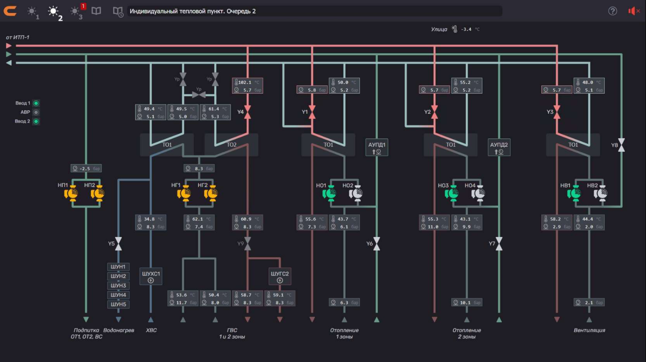 - Температура и давление теплоносителя на подаче и обратке