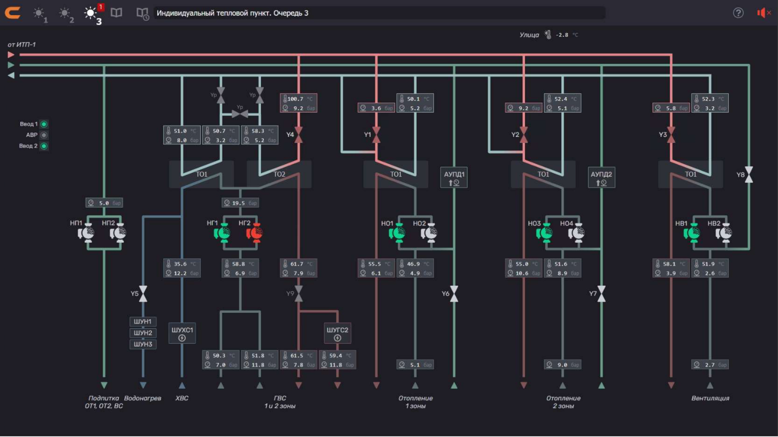- Первичный (теплосетевой) контур: подача теплоносителя от внешней